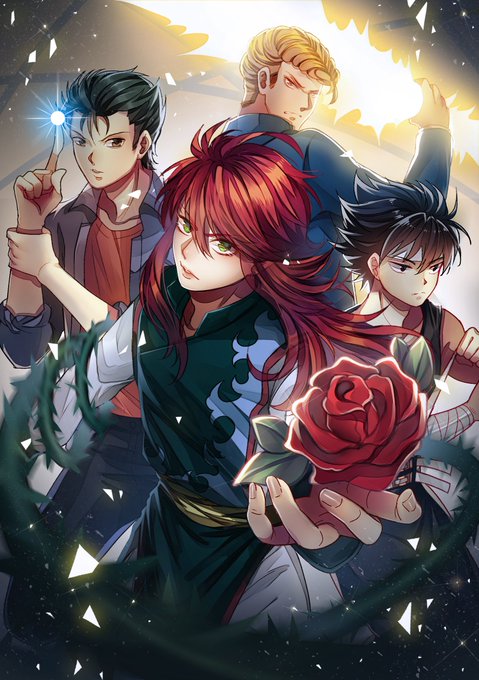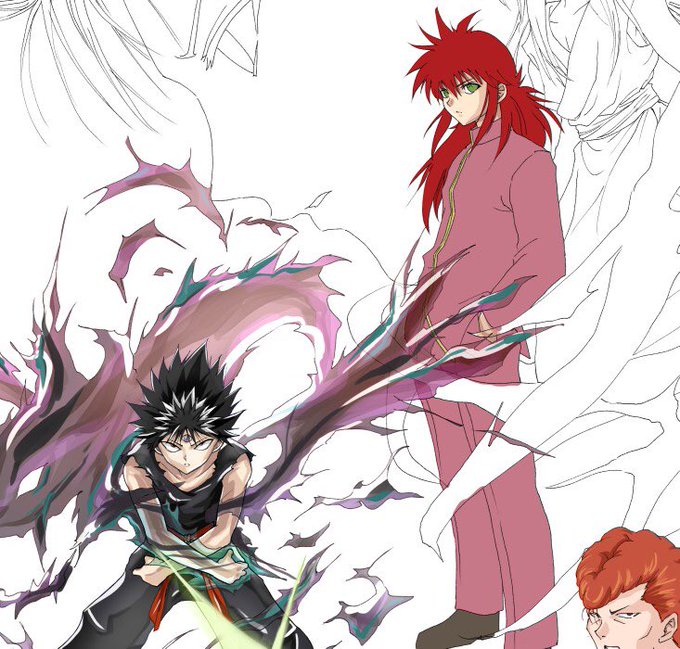 幽遊白書4人組完成した!参考にした元絵は10年くらい前の自分のアナログ絵。一人ずつ描くのがやっとの今となっては4人同時に新規で描く気力があった当時に驚き!