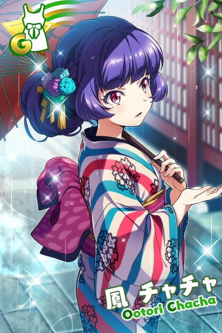 こちらが今回新たに登場、和服が似合うチャチャちゃんのGカード! 「雨で石畳がしっとりと濡れて、よい趣ですね……」 シズカちゃんとの遠出にあいにくの雨…… ですが、チャチャちゃんは意に介さずこの風情を楽しんでいるようです♪ #t7s #ナナシス