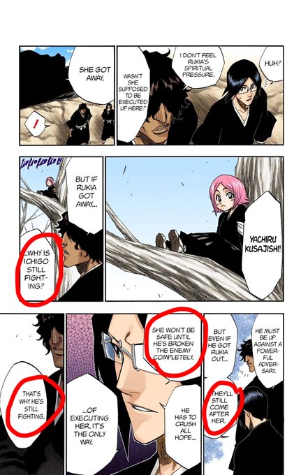 Know what's very funny to me? It's the way Kubo made sure ppl know the difference between Ichigo/Byakuya battle and Ichigo/Ulquiorra one: THE REASON OF FIGHTING. One is obviously for Rukia's sake and one is just for Ichigo to satisfy his thirst for fighting.