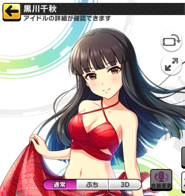 黒川千秋のプライベート用の水着は、モバマスではRとSRの2種類(仕事用や差分を含めるともう少し)が存在した。