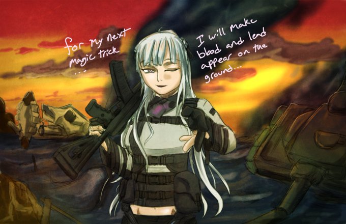 I chose Ak-12 preforming a magic trick on the battlefield.