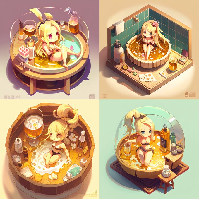 入浴シーン、なんか物足りないなぁ。お盆浮かべて酒のせるか!とリテイクしたら、バーチャル浴室空間を酒場に変えてしまった方がおりまして。。。(ラフ画)