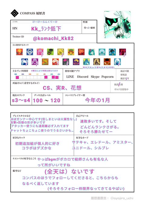 ギルド移動したので履歴書再提出。0314はただいまギルドメンバー募集中のようですぞ(/・ω・)/イラスト既出ですが初めてみられる方もおるかと思うのでこちらもあわせて再提出しとく(´・ ・`) #コンパスお絵かき #コンパスギルド #コンパス履歴書 #コンパスお絵描き #コンパス