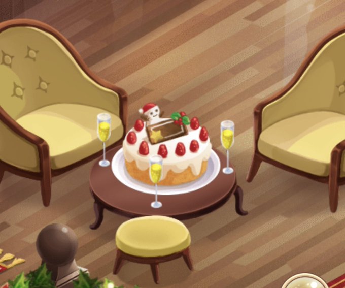 クリスマスケーキが追加されたけど、グラスが3つ!!!!ナビちゃんいるの!!??ナビちゃんその小っちゃいスツールに座るの!?可愛いぞ!!姫様なら呼びそうだもんね!