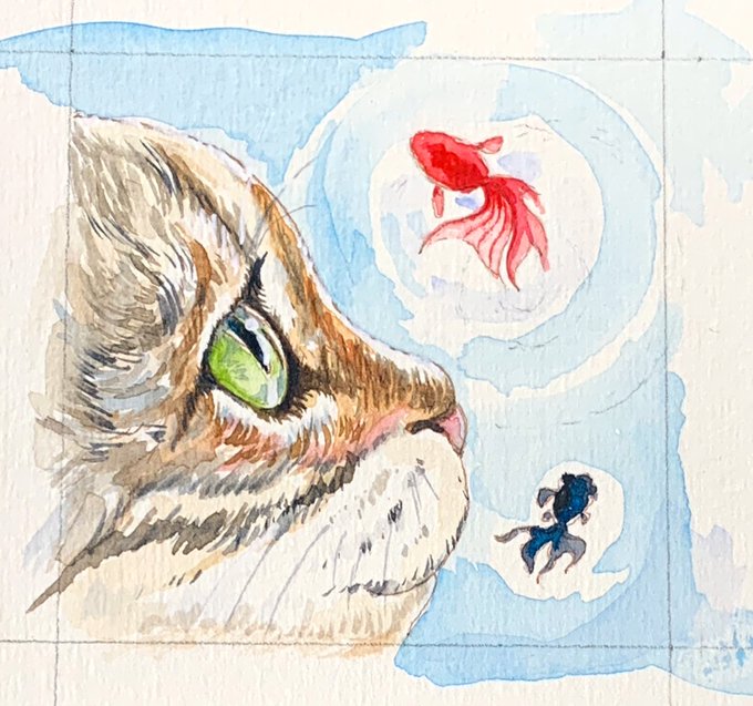 ネコと金魚🎐ちょっと夏らしく。 ネコちゃんのキレイな瞳もかきたかったのです🐈
