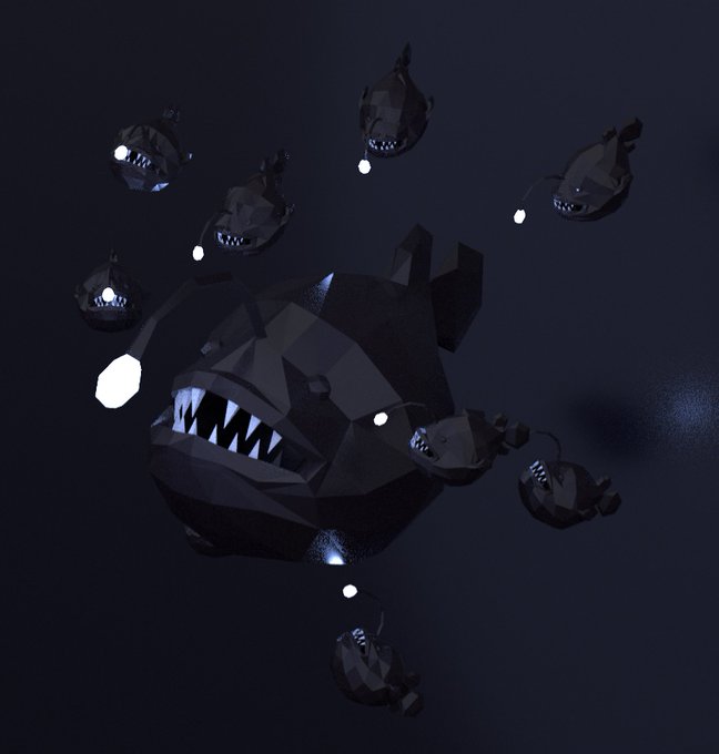 今度は魚類です。チョウチンアンコウです。面白い生態してますよね。明日はリギングとアニメーションまでいけるかなあ。#blender初心者 #blender #lowpoly #indiegames