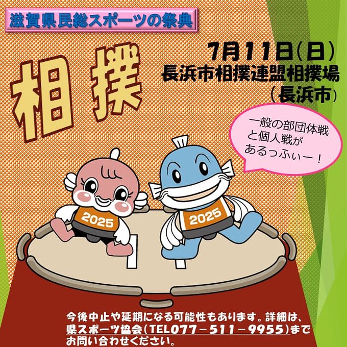 7/10~11スポーツ拳法、7/11フェンシング、カヌー、相撲競技があります。なお、今後中止や延期になる可能性もあります。詳細は、県スポーツ協会(TEL077-511-9955)までお問い合わせください。
