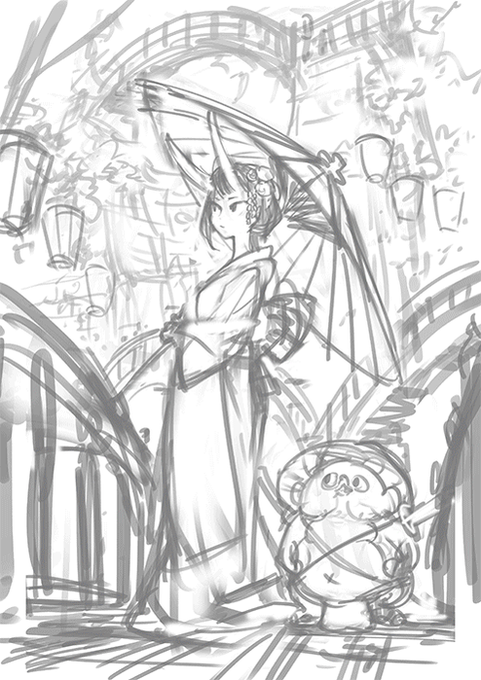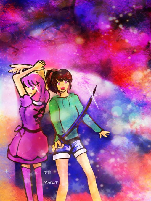 お友達のサクライさんが @sakurai_kouji企画おやりになってたので描かせてもらいました〜4コマの姉妹ちゃん🌸剣持ちの方はちょうど背景練習しててそこへ2人を切り絵とか和風絵巻みたいな雰囲気で描きました〜2枚めは普通に(^◇^;)良い所だけ持って行きそうだよね〜妹ちゃん笑)