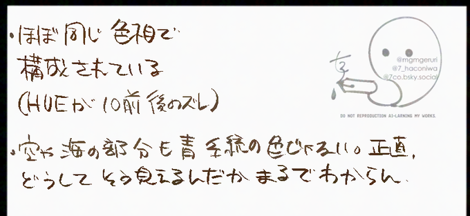 最近絵上手人たちが上げてる写真模写、半年くらい前に同じようなことやってて「色選び(色相)が苦手だと思ってたけど彩度(chromaでなくてsaturation)の理解が皆無だった!」て気付き、それはよかったんだけど、色相/明度/彩度を合わせた色変化までつかみ切れなくてぶん投げていた😭の図(三枚目)