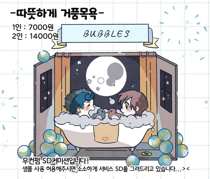 SD 고정틀 거품목욕 커미션입니다! (현재 10% 할인 중!) 목표 수만큼 샘플 작업물이 모일 시 RT 추첨 한 분 작업해드립니다🥰
