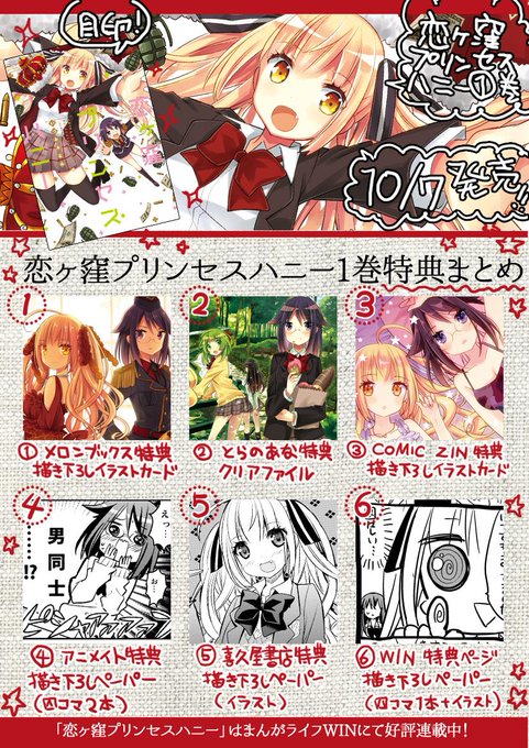 10/7発売の恋ヶ窪プリンセスハニー1巻の特典まとめました!メロンブックス様、とらのあな様、COMIC ZIN様、アニメイト様、喜久屋書店様、で先着限定の特典が配布されます。さらにまんがライフWINにて書き下ろしペーパープレゼント!