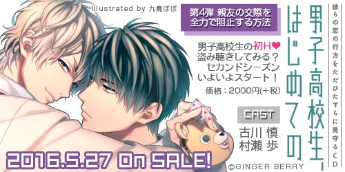 【新作発表】「男子高校生、はじめての」~第4弾 親友の交際を全力で阻止する方法~ ■出演:古川慎、村瀬歩 ■2016年5月27日発売 ■通常盤:2000円+税 アニメイト限定盤:2500円+税 ★第4弾は映研所属の同級生悪友CP!