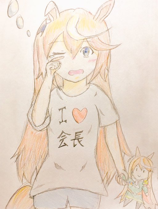 自分的にスピカで一推しのテイオーちゃん描いたー。勝負服メチャクチャムズイー 後ろはカイチョー(わかりづらい)