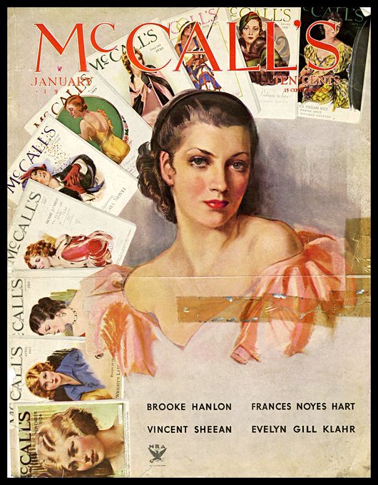 After the war american artist Neysa McMein rose to prominence illustrating covers for McCall's, McClure's, The Saturday Evening Post and other periodicals. Her magazine illustrations depict glamorous young women, often framed as portraits.