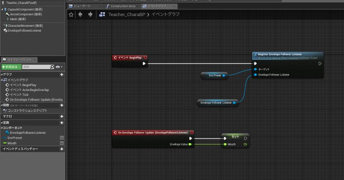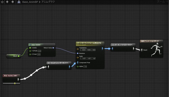 4.AnimBPのアニムグラフで音量変数を受け取ってイベントグラフでMouthボーンの角度を変える