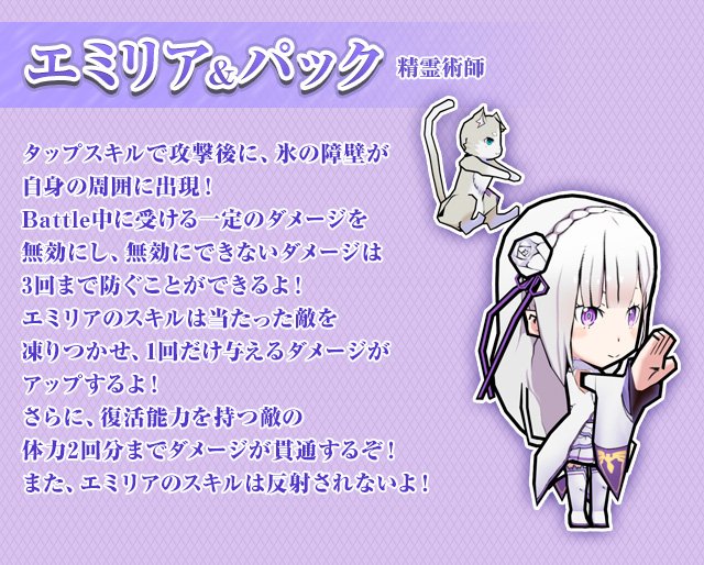 「Re:ゼロから始める異世界生活スロット」では「エミリア&パック」「ナツキ・スバル」「レム」 をはじめとした、コラボメンバーやコラボドレスがラインナップ!無料で1回まわせる「お試し版」スロットがあるみたい!