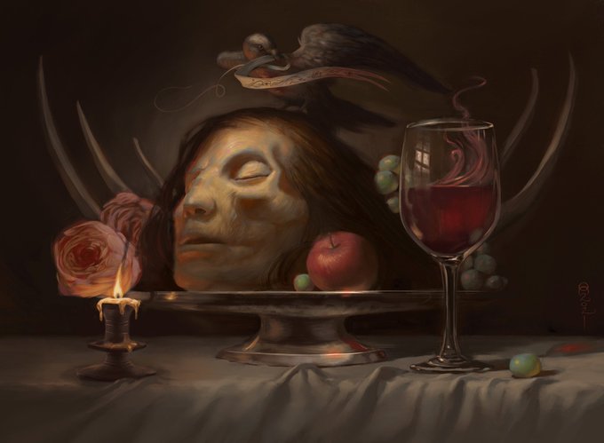Ghoul’s Feast. Piece made for #magicthegathering My take was very moody and symbolic. I wanted to evoke the John the Baptist still lifes I love so much from the Italian #baroque and #mannerism. Note the overlapping #parabolas in the composition. AD was @kieranyanner #WOTCstaff