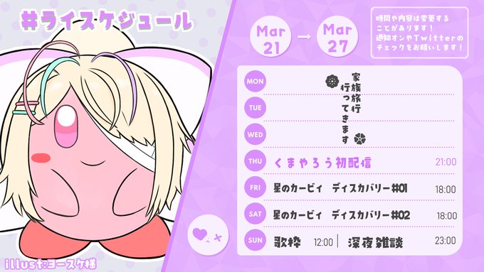 #ライスケジュール Mar21-27 🌸3月ボイス発売中🌸 https://t.co/AGodalnpZI ♡きゅうくらりん歌いました♡ https://t.co/jq1ZeN0O4u Youtube https://t.co/YGTfCBydEN 曲リク https://t.co/1Vn0nbJ0yl main:#九楽ライ FA:#ライjpg Live:#ライing video:#ライmp4