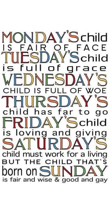 #MythologyMonday Fortune telling rhymes based on the weekday of birth originated in England from the 16th century. Many superstitions existed regarding the days of the week. The fortunes, personalities & temperaments of children were considered regulated by their day of birth.