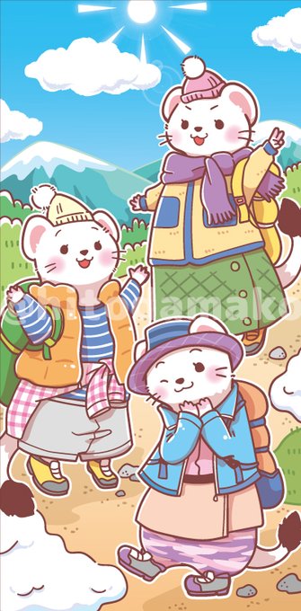 今日は #山の日 なので、過去に描いた遠足のイラストと、お仕事で描かせていただいた山ガール風オコジョちゃんたちのイラスト(コスミック出版様)です✨
