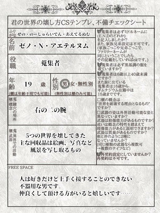 君の世界の壊し方 @Another_end01 さまに参加させていただきます、新米蒐集者のリオです!よろしくお願いします!