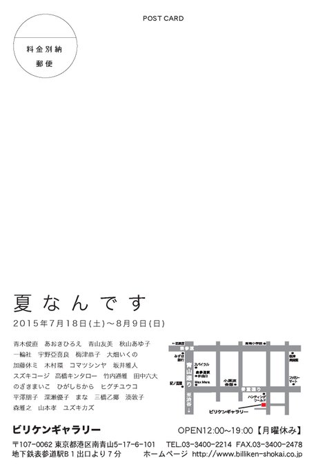〈夏なんです〉(7/18~8/9 月曜休み #ビリケンギャラリー)参加作家③-① 青木俊直/あおきひろえ/青山友美/秋山あゆ子/一輪社/宇野亞喜良/梅津恭子/大畑いくの/加藤休ミ/木村環 つづく…