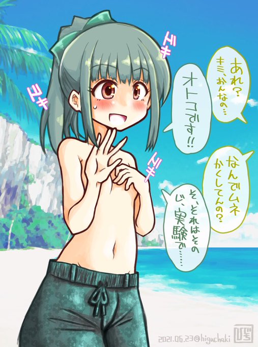 エリカも納品されました!男水着チャレンジではありません。ちょっと大胆な格好をしたけれど、恥ずかしくなってレギンス履いた感じでした。泳ぐと言うより遊ぶ為の格好なイメージ。