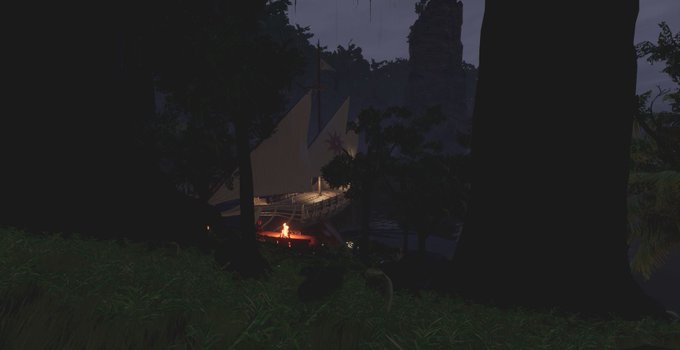 入り江に停泊する帆船を発見