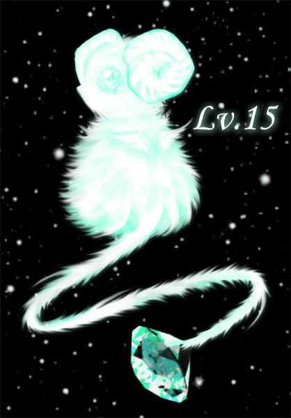 第一進化。キラキラ輝く瞳は感情によって様々な色に変化し、背中の羽が小さく飛ぶことができずとも密かに毎日飛行練習をしている。尻尾の先端は普段宝石の形をしているが見た物に変化する能力を持っている。次は25RTで進化します