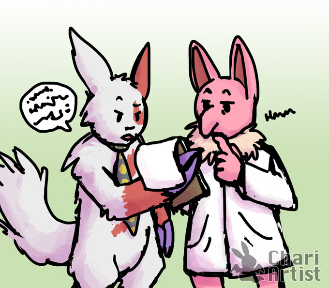 Lil' fanart of @ProfWormwood 's hypno (Miguel) discussing pokémon assistant things with my zangoose (Ruby)!