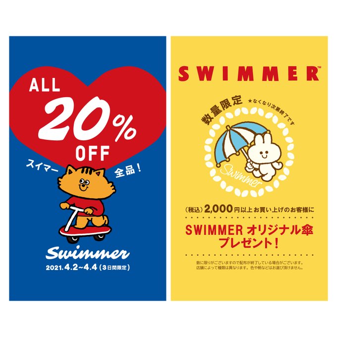 SWIMMER商品全品20%OFF!SWIMMERオリジナル傘のプレゼントもあります!