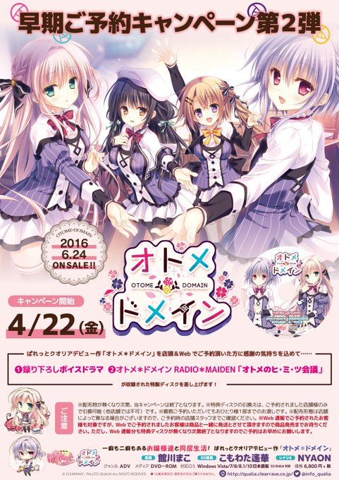 【キャンペーン情報】ぱれっとクオリア様より6月24日発売『オトメ*ドメイン』の早期予約キャンペーン第2弾が4月22日より開始!新規予約または予約済みの方に、ここでしか聴けないボイスドラマ等が収録された『特製CD』をプレゼント!