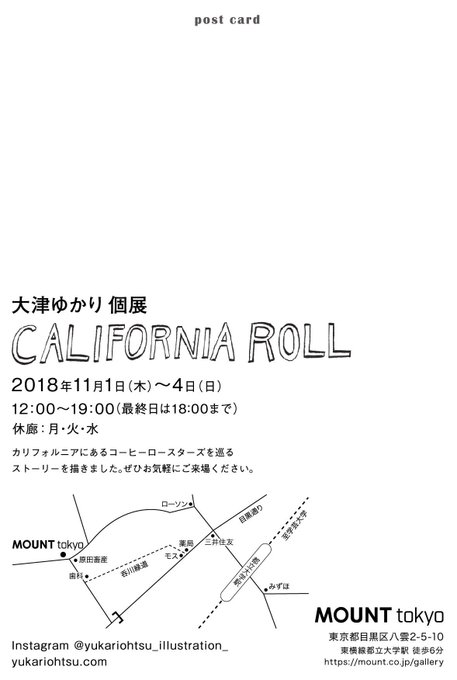【MOUNT tokyo】11/1(木)〜11/4(日)大津ゆかり個展「CALIFORNIA ROLL」カリフォルニアにあるコーヒーロースターズを巡るストーリーを描くイラストレーション展。MOUNTでは約3年ぶりの個展となります。展示限定のZINEも制作中!コーヒー好きな方にもおすすめですよ。ぜひご来場ください。