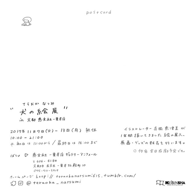 DMとフライヤーをユビフルギャラリー(@ubeful)、ギャラリーモーニング、ギャラリークンストアルツ、同時代ギャラリー、恵文社一乗寺店に置かせていただいてます。よろしくお願いします。恵文社でエドワード・ゴーリーの本2冊買いました。