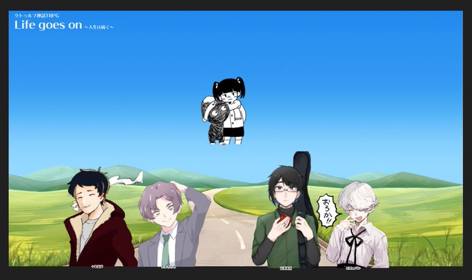 @trpg_tl 「Life goes on ~人生は続く~」、PLけぐまさん/PC夏目 輝夜さん、PLむくさん/PC青宍 椒さん、PLさじょさん/PC天月 暁さんをお迎えして回してます。お昼休憩~!!みんながんばっていこね!
