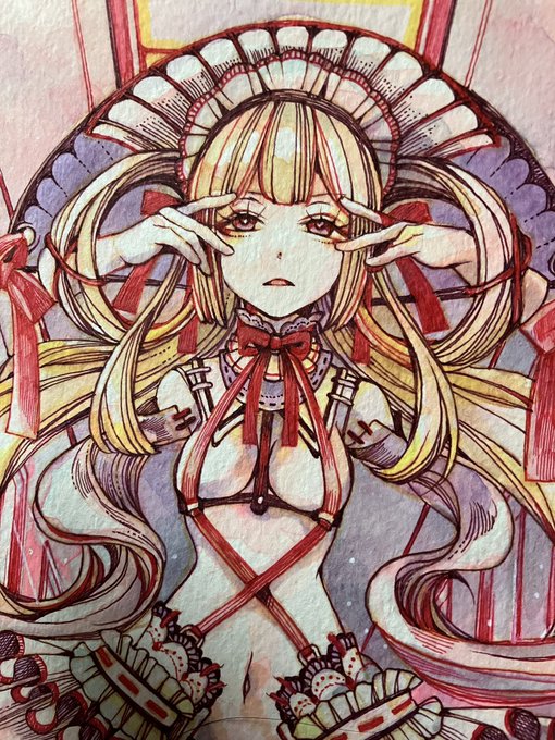 下地塗りは水彩。 線は赤と茶のボールペン。 仕上げはコピック。 コピックたまにしか使わないから色数少ない。もっと増やしたら絵がよくなるんかな。この絵自体身近な人らには大不評でそんな色数云々以前の話でもあるww