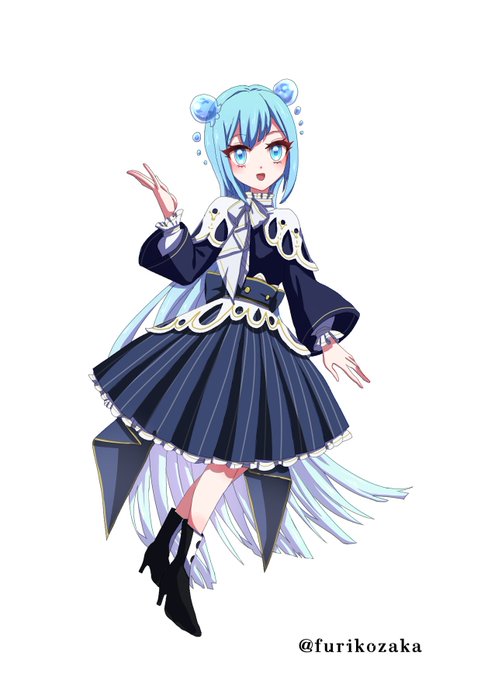 衣装のモチーフは聖歌隊とセーラー。水=流れる ということで縦のラインがあるプリーツスカートにしました。