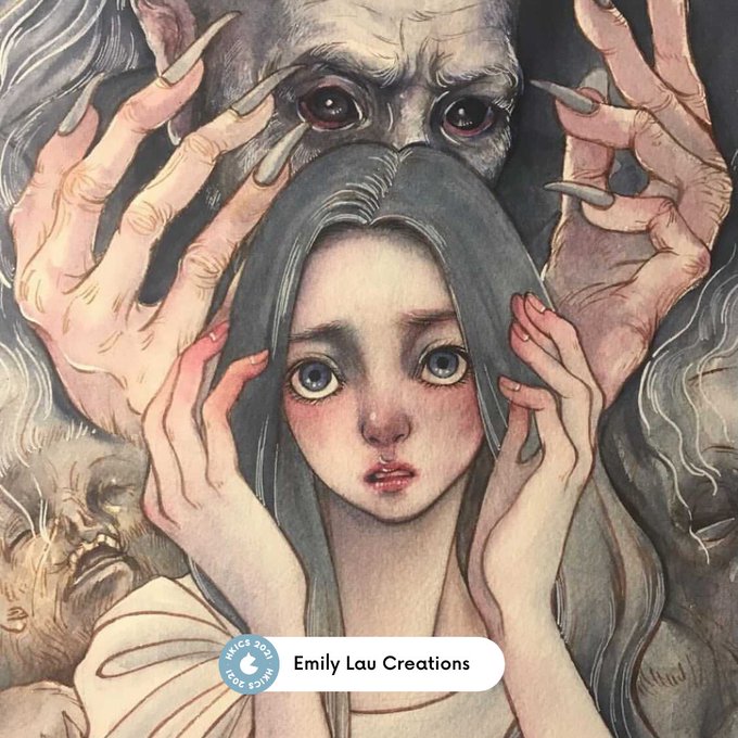 Emily 最愛恐怖電影、科幻故事和各種靈異雜學,她喜歡以水彩描繪或詭異或可愛的人物和情境,筆觸獨特,帶有一種另類情調。🦇🦇