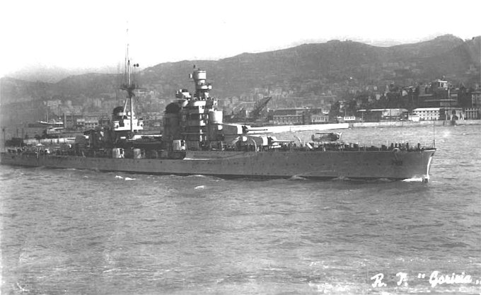 【ゴリツィア】ザラ級の一隻。WW2では1943年に米空軍の空爆で損傷、行動不能になるまで多数の海戦に参加。タラント空襲では英軍機の撃墜戦果も。イタリア講和後はドイツ軍により閉塞船として利用される。その後、イタリア軍のコマンドによる撃沈作戦の標的になるも失敗。1946年解体処分。 #戦艦少女