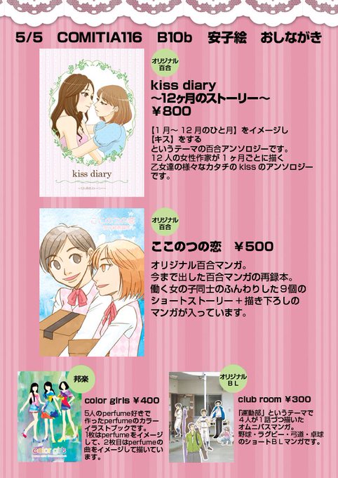 おはようございます!本日5/5【COMITIA116】に参加いたします!スペースは【B10b 安子絵(あこえ)】です!百合アンソロジーを販売しておりますので、どうぞよろしくお願いいたします!
