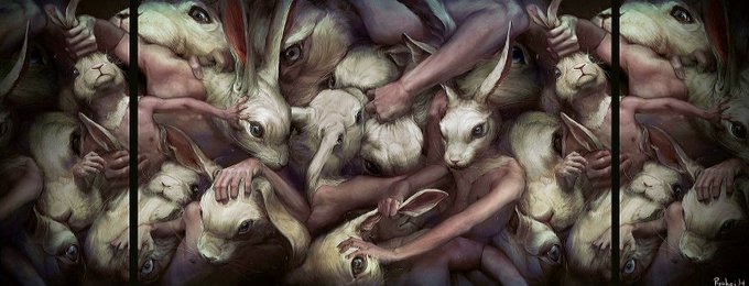 @nancyloumac54 @Jennife47568904 Thanks, Nancy. I discovered Ryohei Hase's art this spring when looking for unusual art to share for Easter, and found a similar triptych of his, only with rabbits, which I'm attaching. I find his art disturbing and beautiful at the same time.