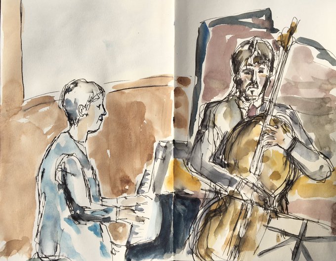 Enjoying sketching live from the lovely concert by @susantomespiano and @philiphigham from @wigmore_hall recorded broadcast #thedailysketch #paintseptember