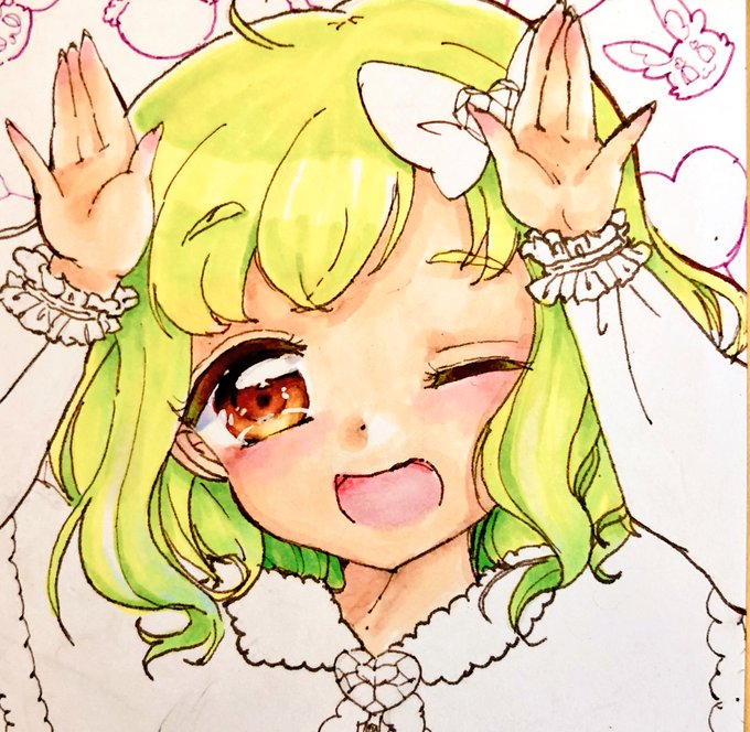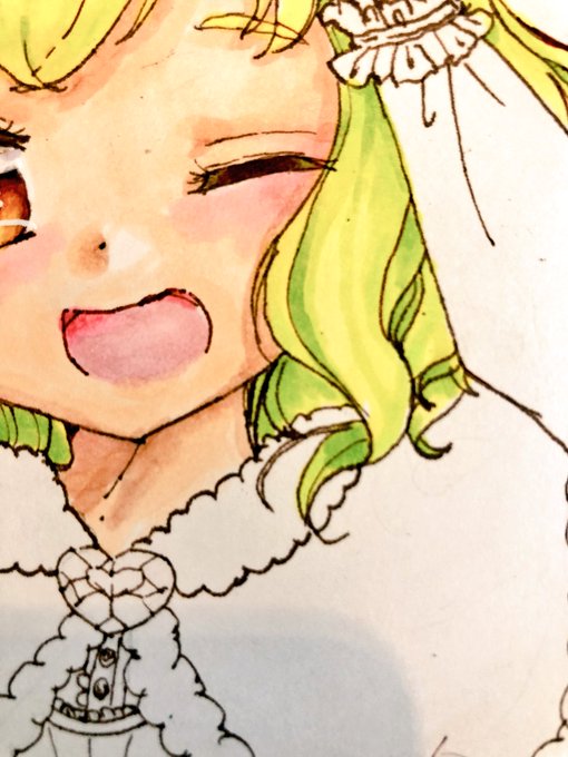 ④毛先や影のぼかしたいところをベース色でぼかす、毛先だけ水色を使いました(画像1枚目2枚目がビフォーアフター)→⑤毛先に薄い水色を重ねて顔にかかってる部分ほんのり肌色いれる→0番台透明でなじませ&光沢を入れて髪の毛基本塗り完成 ホワイトは最後にやります。