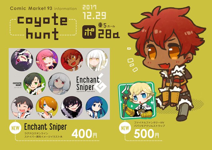 【C93】東5 ポ-28a「coyote hunt」にて参加します。今回の新刊はROスナさんの属性イラスト本、FF14パパリモのアクリルストラップです。当日はよろしくお願いします~!