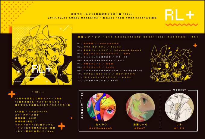 12/29冬コミ1日目 『NEW YORK CITY』東エ28aにて 新作:鏡音リン・レン10周年記念合同画集『RL+』を頒布します~~~~~~!!!!!メンツ千葉県民だよ 会場特典もついてくるよ!ぜひお越しください! #RL_plus