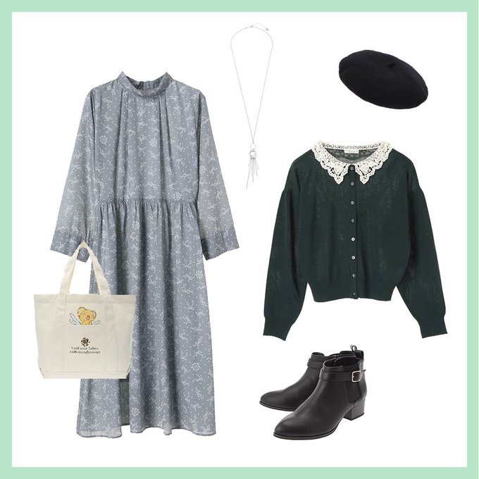 リボンと夢の鍵の総柄プリントのワンピースに、小狼イメージのダークグリーンのカーディガンを合わせたガーリースタイル😊👍👍ワンピースはMとLの2サイズをご用意しております😉💕