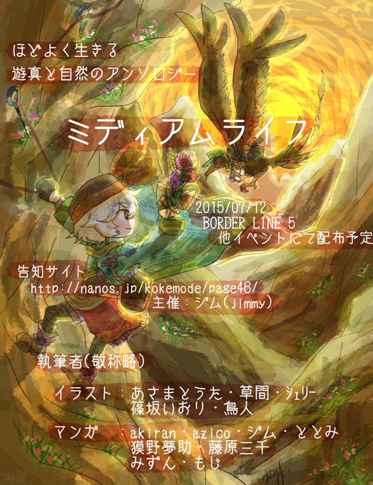 遊真と自然のアンソロジー「ミディアムライフ」を発行します。7/12の東京ボダラをはじめ、いくつかのオンリーにて頒布します。このようなフライヤーを4月以降も配布します。配布日などの情報はこちらhttp://t.co/dwQFin8Jx9