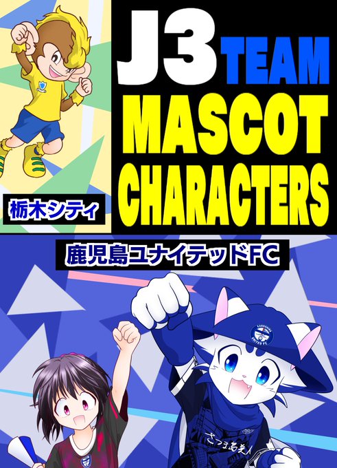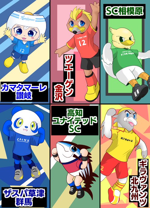 J3チームマスコットキャラ大集合イラスト、キャラが重なってほとんど見えないけど