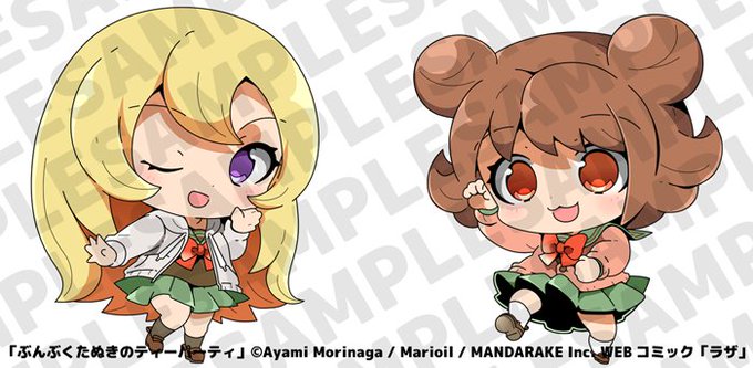 大まん祭(5/4~5/6開催)https://t.co/tLIO0iFQwW にて販売される「ぶんぶくたぬきのティーパーティ」アクリルキーホルダーを鋭意製作中です♪今回はりさ&ふみのイラストを公開!!まりオイル先生(@marioil)にご執筆いただきました♪ラストのお兄ちゃんイラストと販売についての詳細は近日公開! #大まん祭
