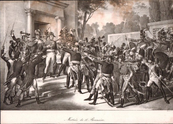 革命に共感したリュシアンは政界入りして頭角を表した。ブリュメール18日のクーデターではナポレオンを扶けて総裁政府を覆し、兄を見事第一統領に据えた。その後兄の政府にて重職を任されるが、次第に険悪な関係になる。(画像:ブリュメール18日のクーデター)